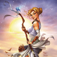 blonde hair and is depicted with a bow in her hand, aiming it upwards towards the sky, which suggests she might be shooting at something or practicing her skills. The background features a sunset or sunrise, indicating that the scene is taking place during
