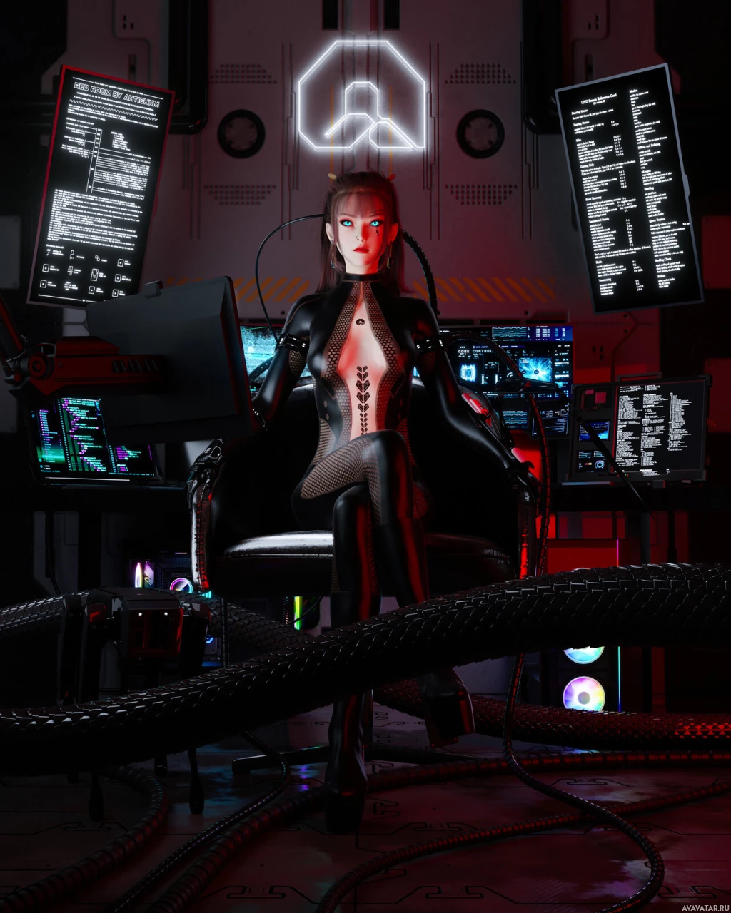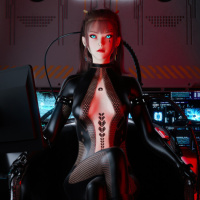 technology integration. Her hair is styled in a way that it resembles circuitry or wires, adding to the futuristic theme of her appearance. She is seated at a control panel with multiple screens displaying various data, indicating she might be monitoring or controlling some form of