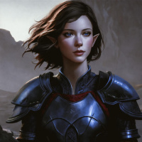 armor pieces, suggesting she might be a warrior or a member of a knightly order in a fictional universe. The background is somewhat misty, which adds to the mystical and fantastical atmosphere.