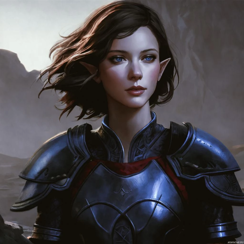 a female character dressed in medieval-style armor, indicative of a fantasy setting. She has pointed ears like an elf and is gazing off to the side with