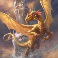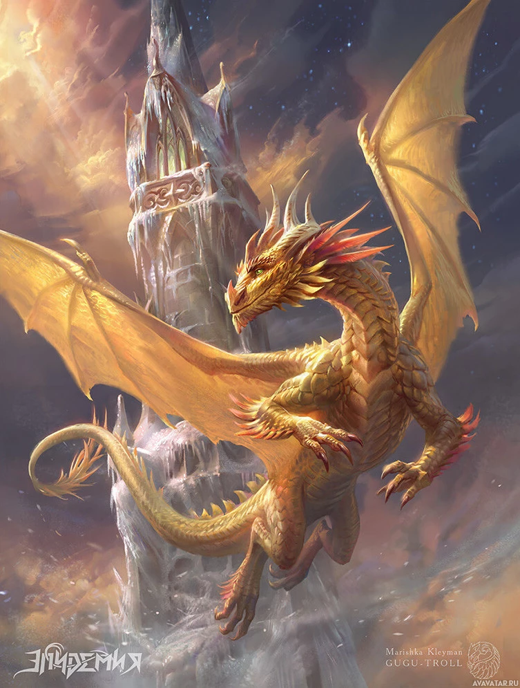 a fantastical scene with a dragon soaring through the air. The dragon has a colorful design, featuring red and yellow scales with intricate patterns,