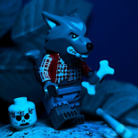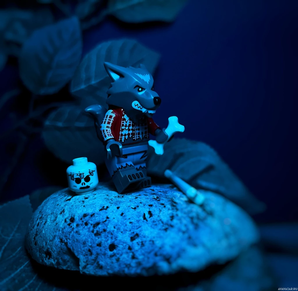 a Lego figure resembling a werewolf, seated on what appears to be a rock. The werewolf is wearing a red and white striped shirt with black pants, and has