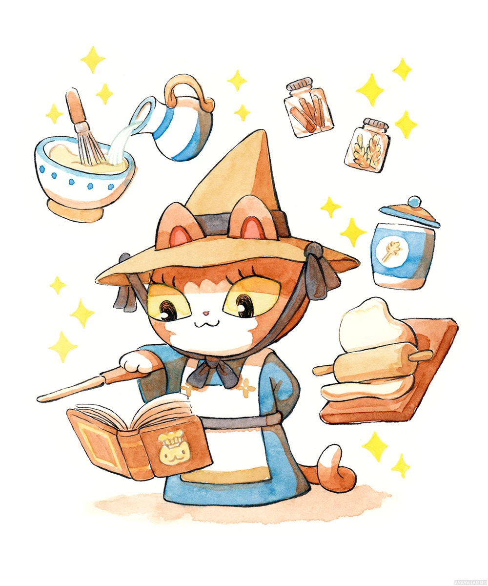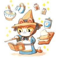 an illustrated character resembling a cat wearing a witch's hat, with wings sprouting from its back. The cat is standing on what appears to be a cookbook or recipe book, and various