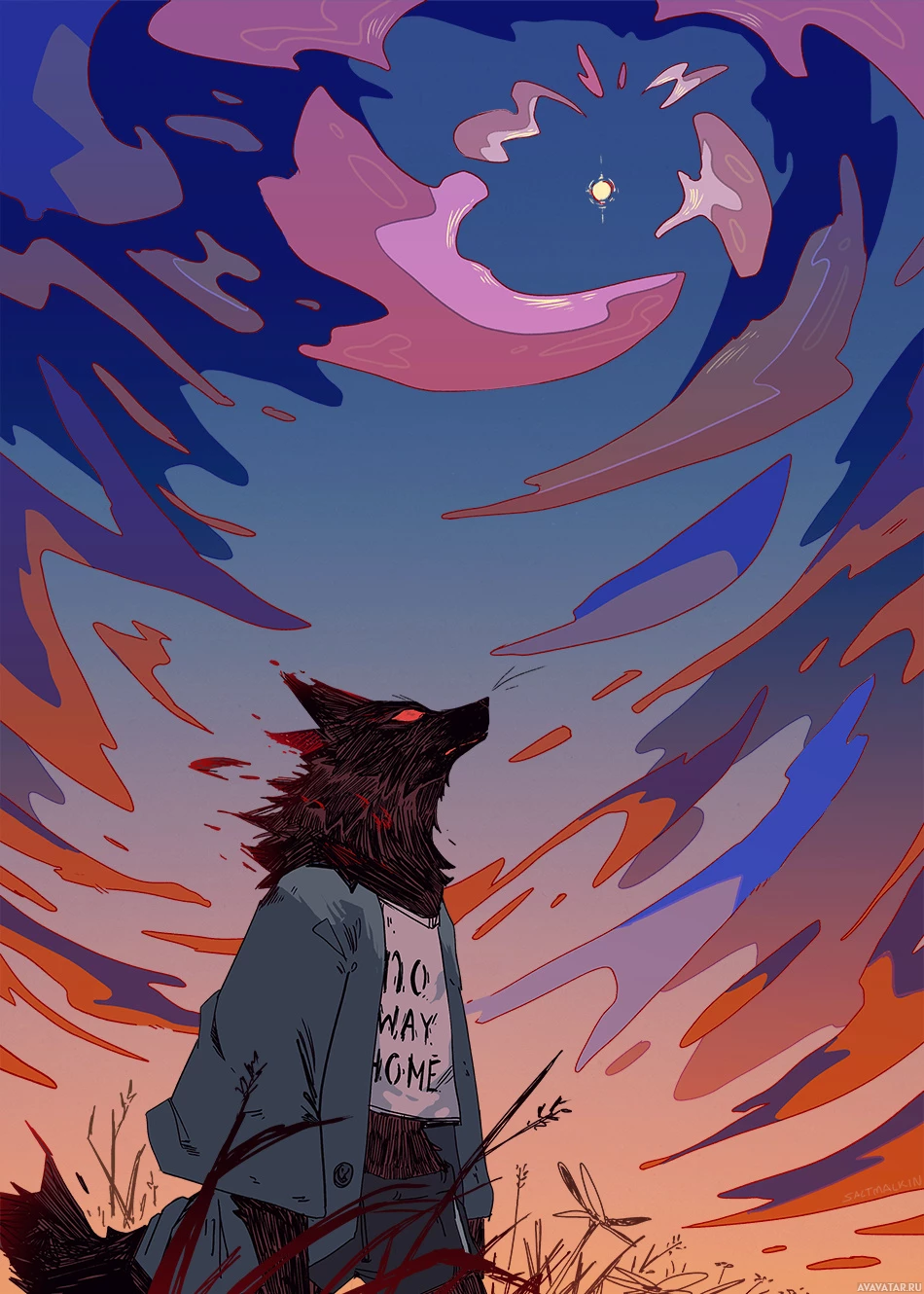 This is an illustration depicting a werewolf sitting on the ground, gazing up at