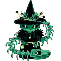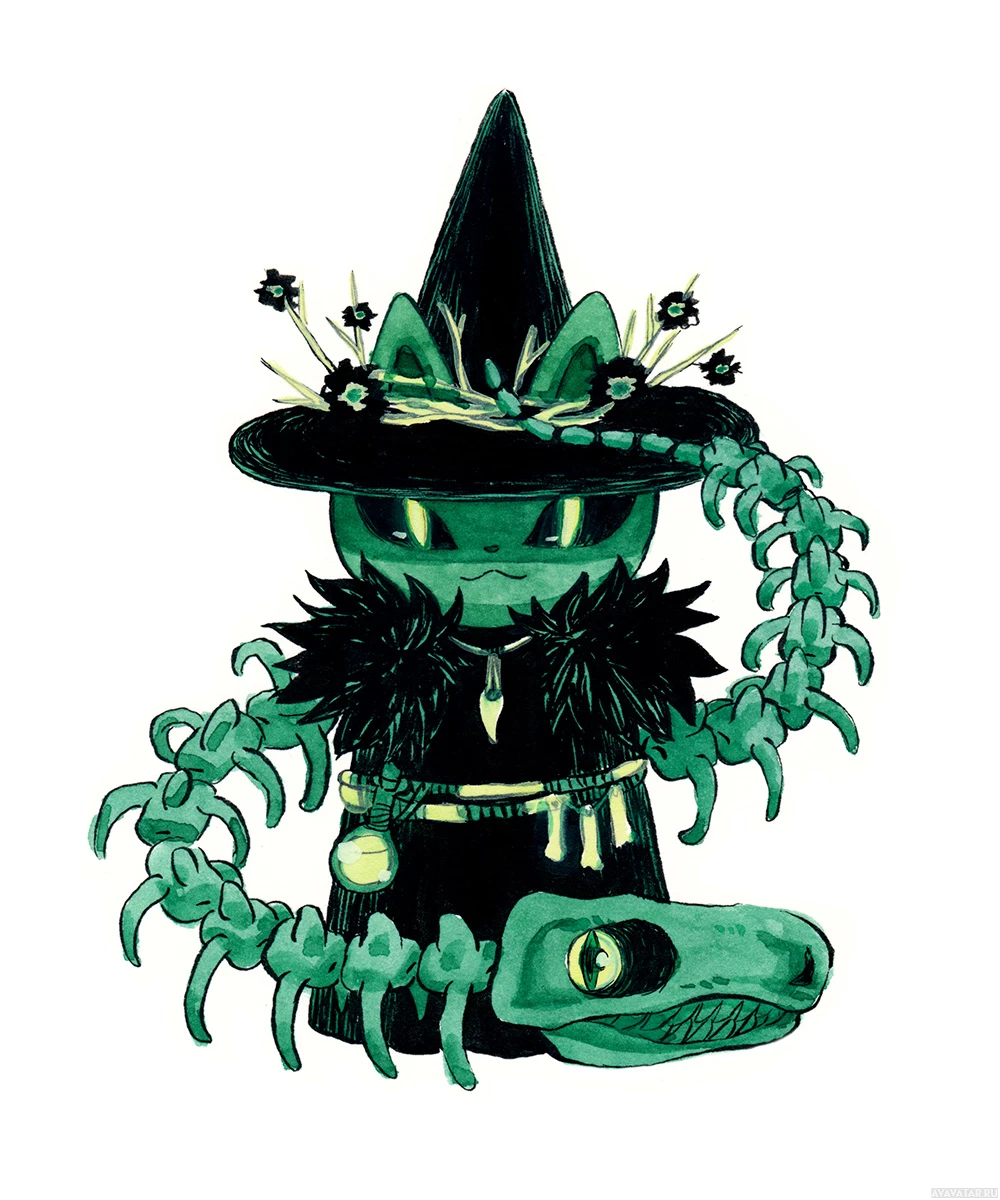 a blend of a cat and a witch. It has the body shape of a cat with long, thin limbs, and the head resembles a typical