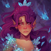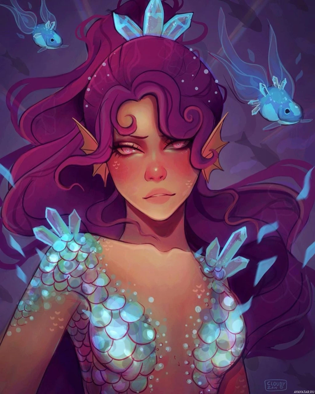 a mermaid tail and has scales on her back, along with what appears to be blue crystals or jewels around her neckline. There are fish-like creatures swimming near her head, and her expression seems contemplative or sad. The art style is vibrant and detailed, evoking