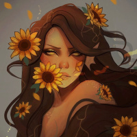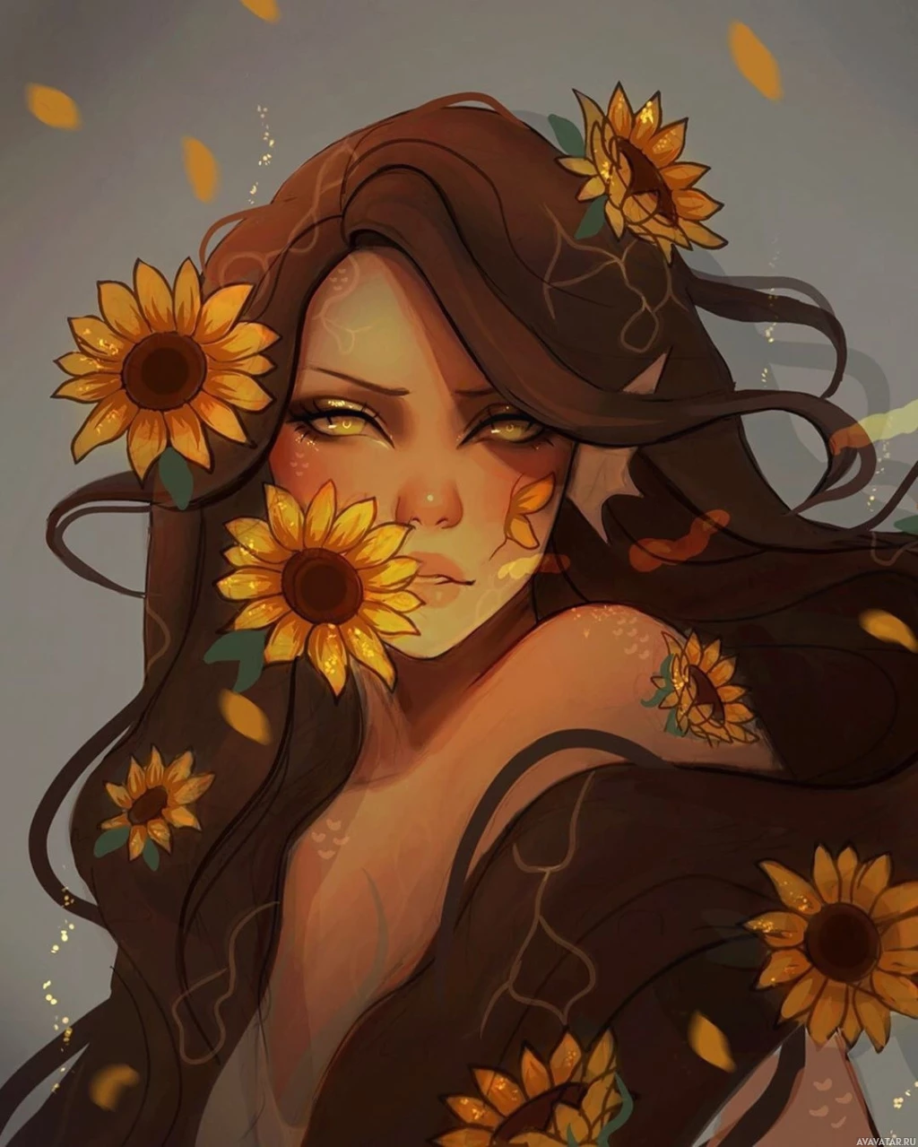 striking aspect is the abundance of sunflowers around her head and shoulders. These flowers are golden and appear to be floating or suspended in mid-air, suggesting a magical or otherworldly quality. There's also a subtle presence of what could be leaves or petals scattered around her, adding to