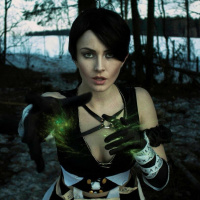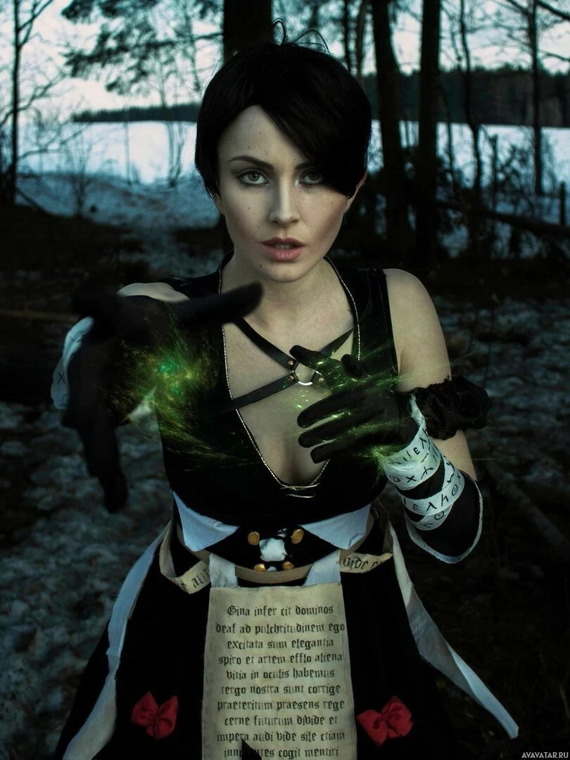 a person in costume, likely cosplaying as a character from the "The Witcher" game. The individual is wearing a medieval-style dress and has