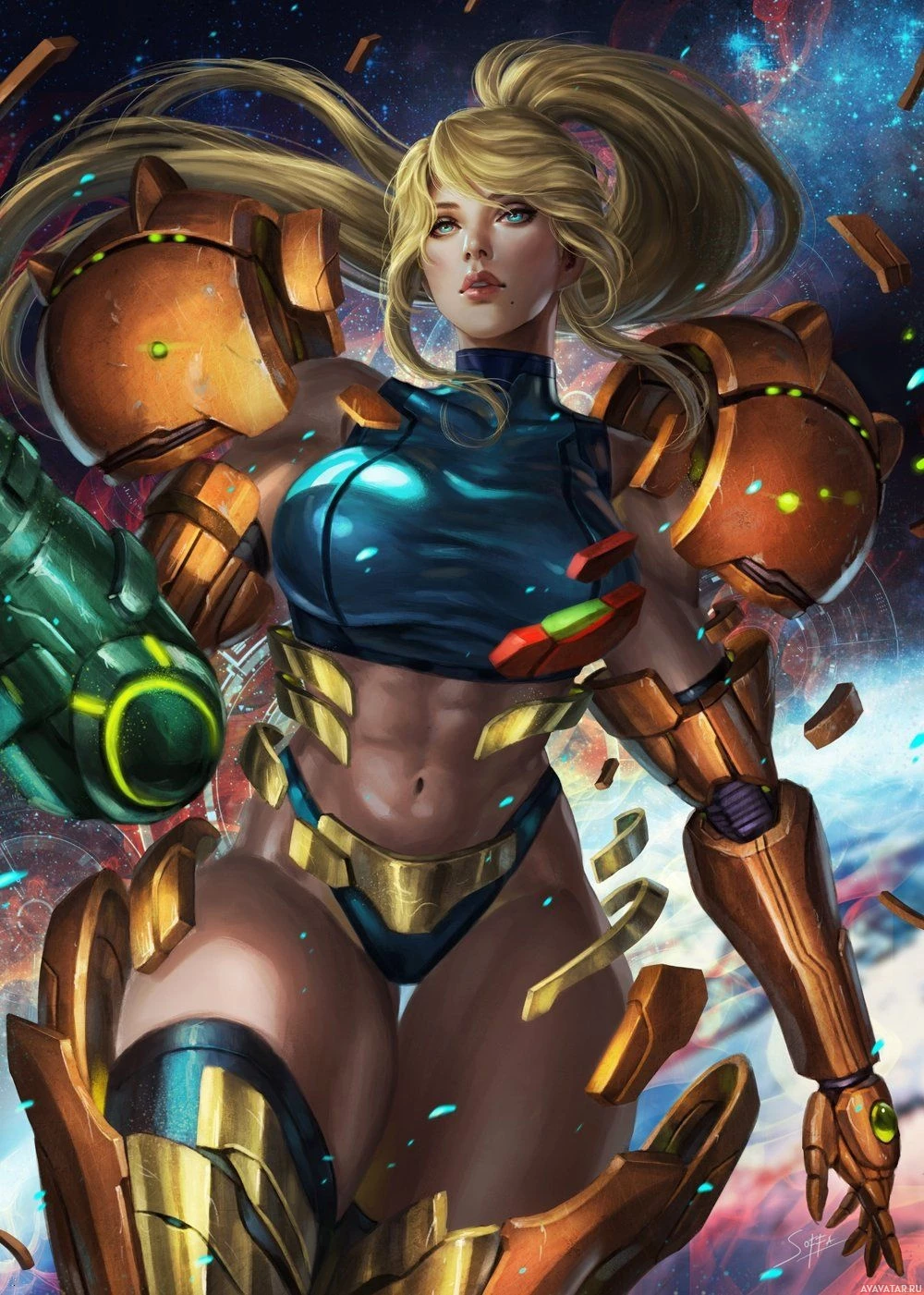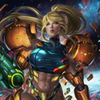 a female character from the "Metroid" video game series. She is depicted wearing her