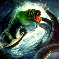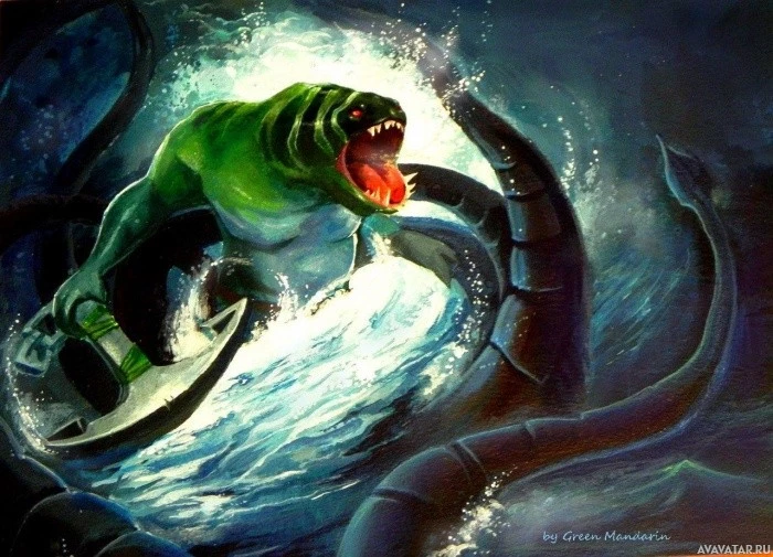The image shows a vibrant and imaginative illustration of Tidehunter, a character from the popular