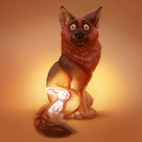 The image shows a dog and a rabbit. The dog is on the right, looking surprised or startled, with its mouth open and ears perked up. The rabbit is on the left, sitting calmly next to the dog's tail. Both animals are depicted in a realistic style with detailed fur textures, indicating that they may be pets. The background has a warm tone, suggesting