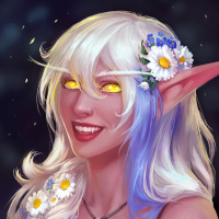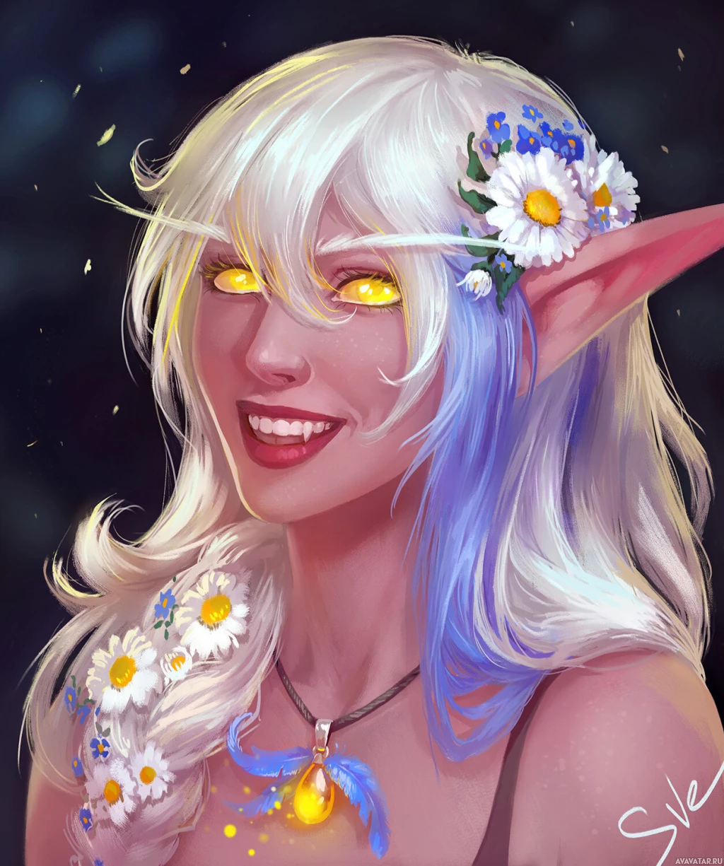 blue eyes and is adorned with what appears to be daisies or similar floral elements in her hair and around her headband. Her expression is cheerful, with