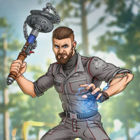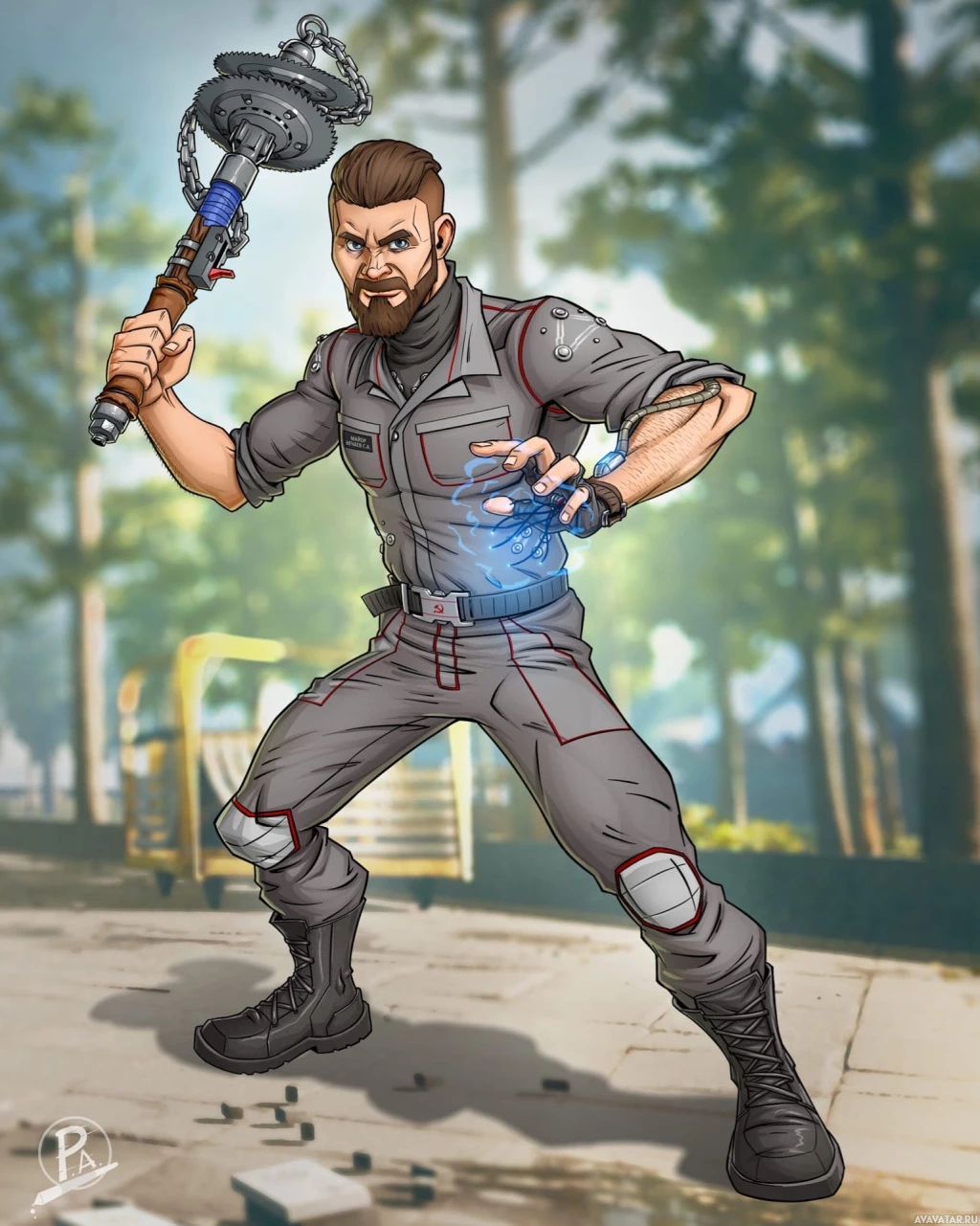 the video game "Atomic Heart." This character is depicted as a man with a beard, wearing military-style attire and holding what seems to be a weapon or tool, possibly related to combat or exploration within the game. The artwork captures