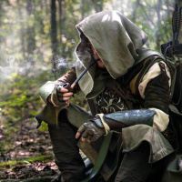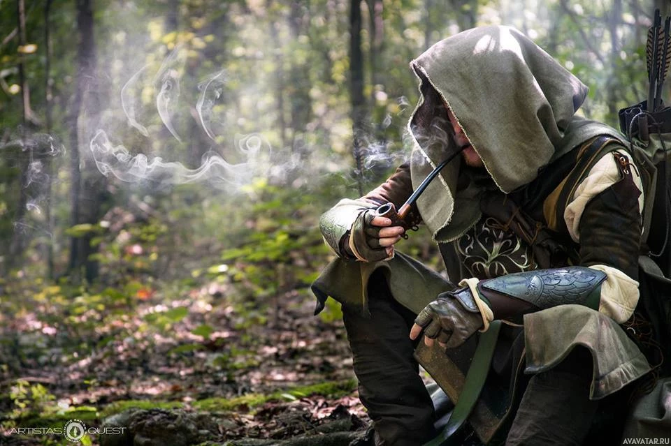 a woodland setting, smoking a pipe. The person is holding a bow and is dressed in fantasy-style clothing that suggests a character from the Lord of