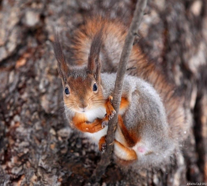 The image shows a squirrel perched on a branch. It appears to be an adult squirrel with