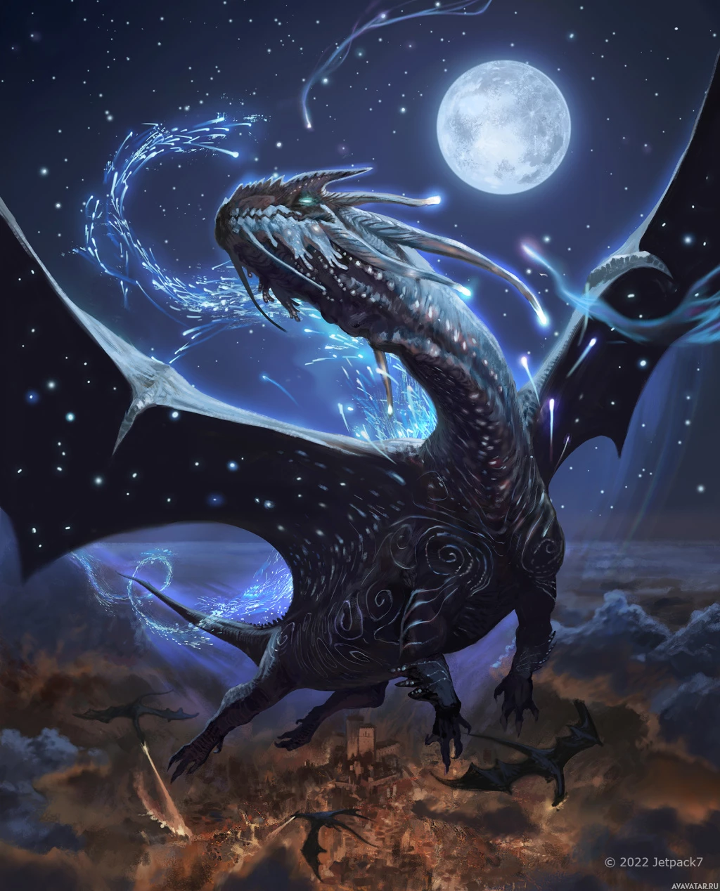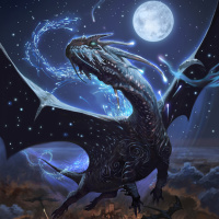 a night sky with the moon visible in the background, which could suggest that it's nighttime or set in a magical realm where the sky can be moonlit even during the day. The dragon itself has