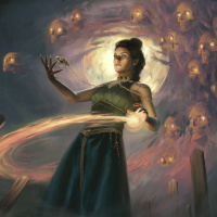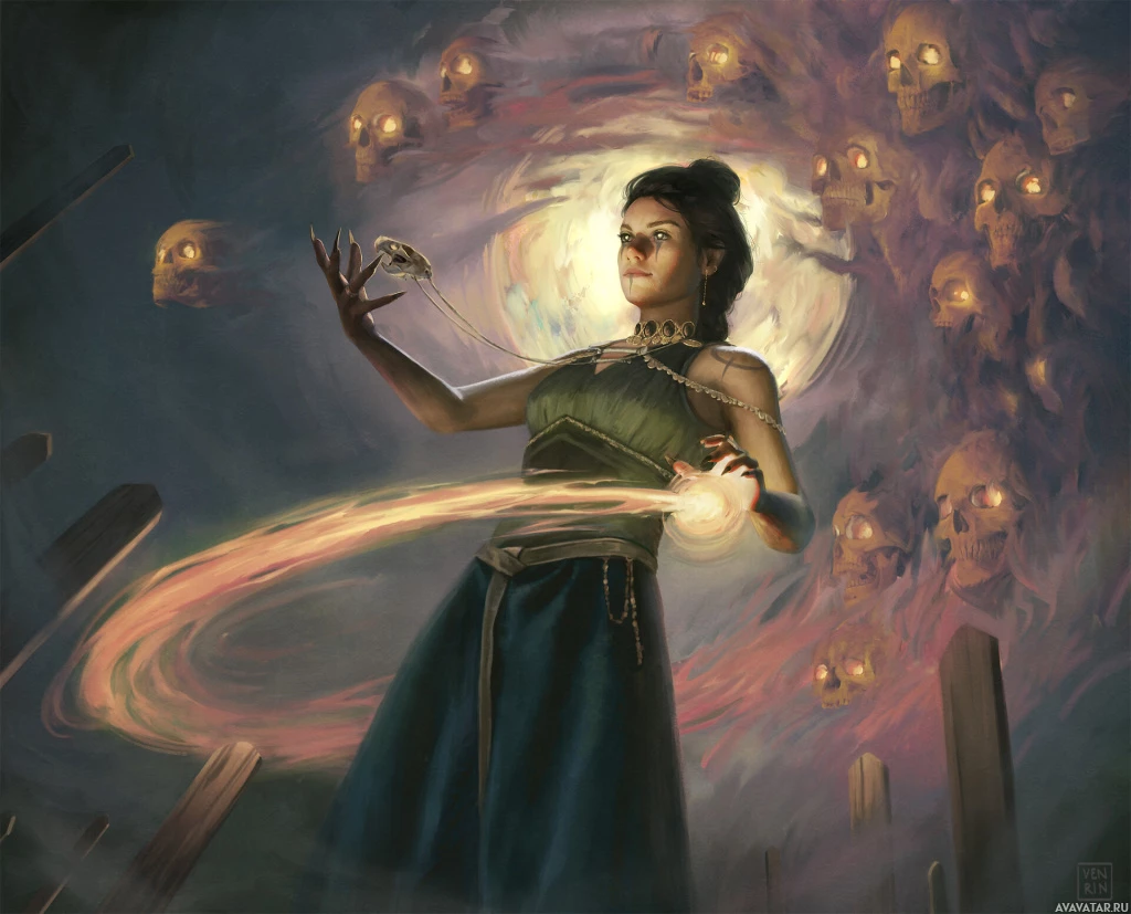 the magical aura surrounding her hand. The scene has fantastical elements, such as floating skulls and what looks like