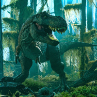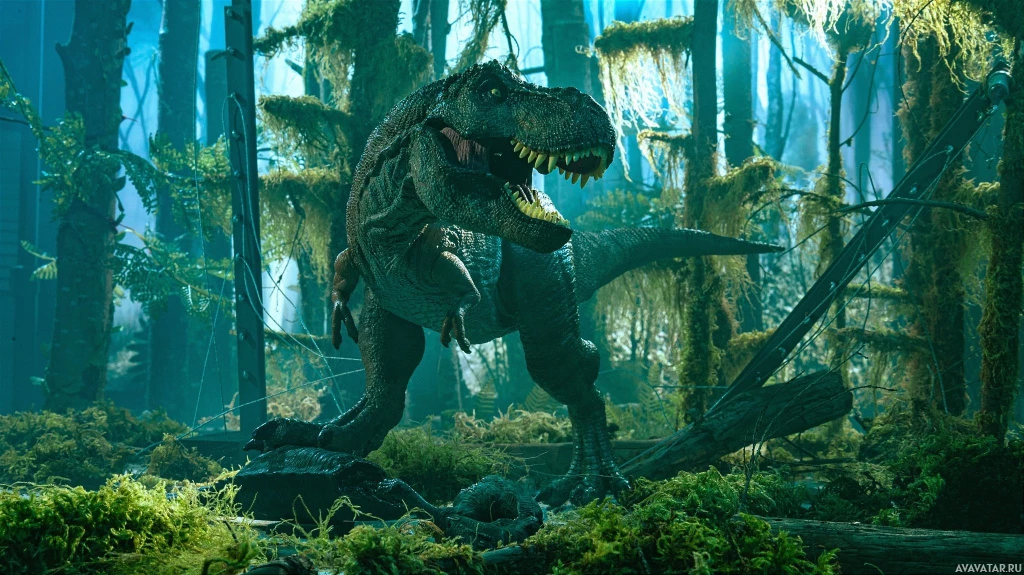 На картинке изображен тираннозавр Рекс в окружении густого туманного леса. Это ненастоящее окружение; скорее всего, это сцена из фильма или видеоигры, в которой изображен доисторический ландшафт.