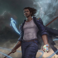 long hair and is holding a staff that emits blue energy. In the background, there's a tumultuous sky with