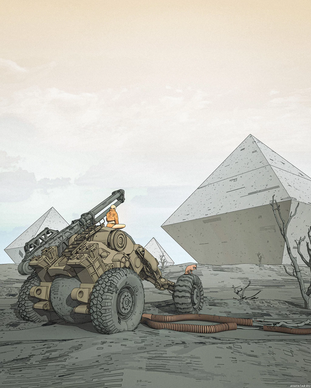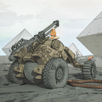 The image depicts an artistic illustration of a military or exploration vehicle on what appears to be the surface of a moon or another