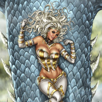 a mythical creature, possibly a dragon or griffin, which is depicted with intricate scales and sharp claws. The character is wearing armor that looks like it's made from a combination of metal and leather, and she has a fantasy-themed design that might suggest she is a warrior or heroine in
