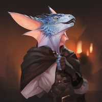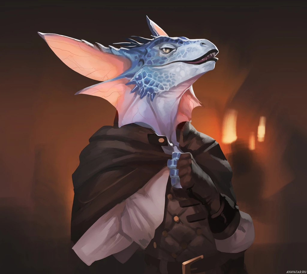 an illustrated character that appears to be a blend of human and dragon features. This