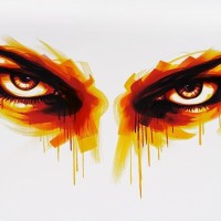 vibrant colors that give it an intense and dramatic effect. The use of yellow and red tones gives the piece a fiery appearance. The background is not visible in this image as you've only described the eyes.
