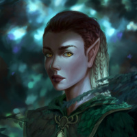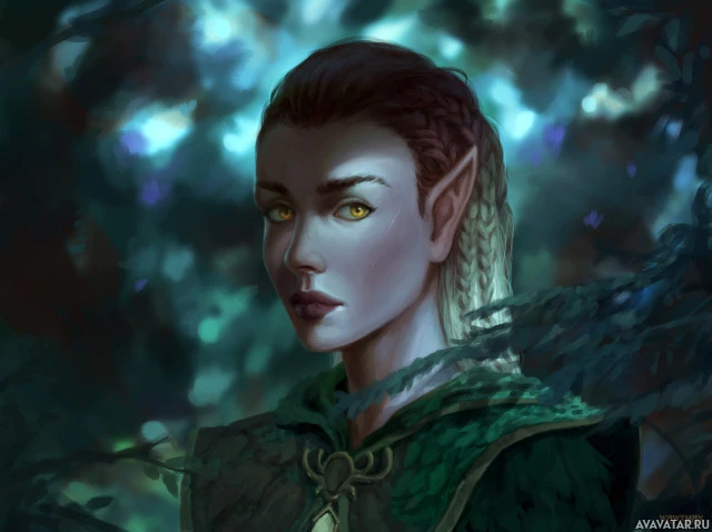 an illustrated character that appears to be an elf, often associated with fantasy settings. She has pointed ears and is dressed in attire that suggests a blend of natural and possibly magical elements, such as