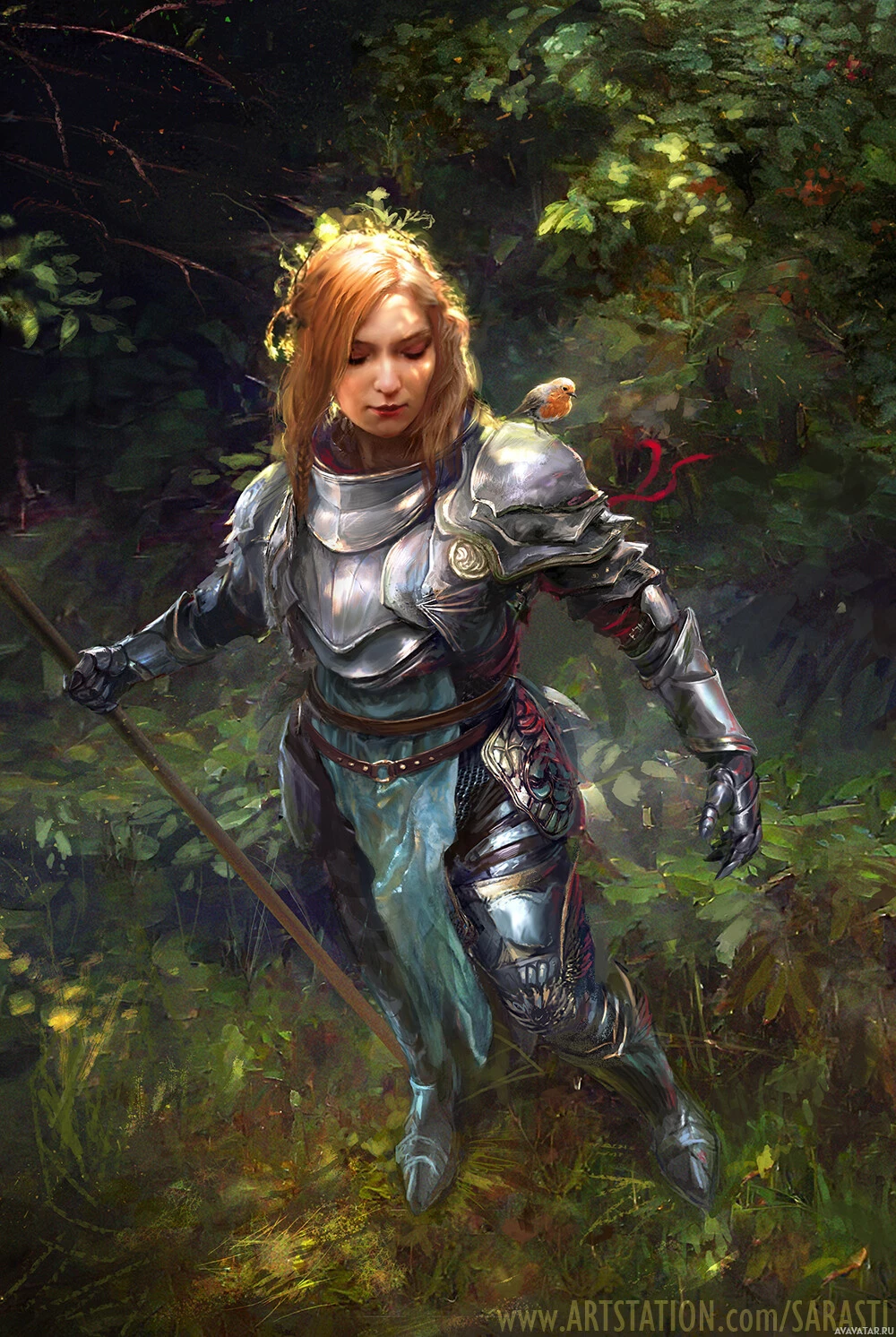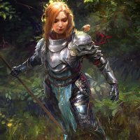 an outdoor environment, possibly a forest, with misty surroundings and what appears to be a lance in her hand. The style of the artwork is detailed and realistic, giving it a somewhat