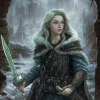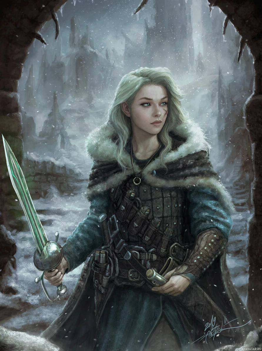 На картинке изображен персонаж женского пола с белыми волосами, одетый в доспехи в средневековом стиле и держащий меч. Кажется, что она стоит на улице в снежный день, о чем свидетельствует холодная атмосфера и наличие снега на земле.