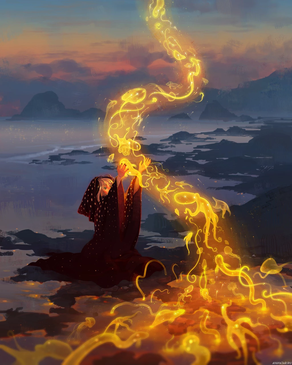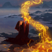 На картинке изображен анимационный персонаж, который выглядит как молодая девушка в одежде с капюшоном, скорчившаяся на земле. Она окружена пламенем, которое либо исходит из ее рук, либо каким-то образом контролируется. На заднем плане изображен прибрежный пейзаж в сумерках или на рассвете, вдали видны силуэты гор.
