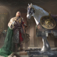 an armored warrior wearing what looks like traditional Norse or Celtic attire, including a helmet with a crest and a fur cape. The warrior stands on a platform, holding a sword. Next to the warrior is a majestic white horse, adorned with