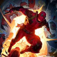 book universe or related media. Additionally, there is an explosion occurring behind Deadpool, which adds to the action-