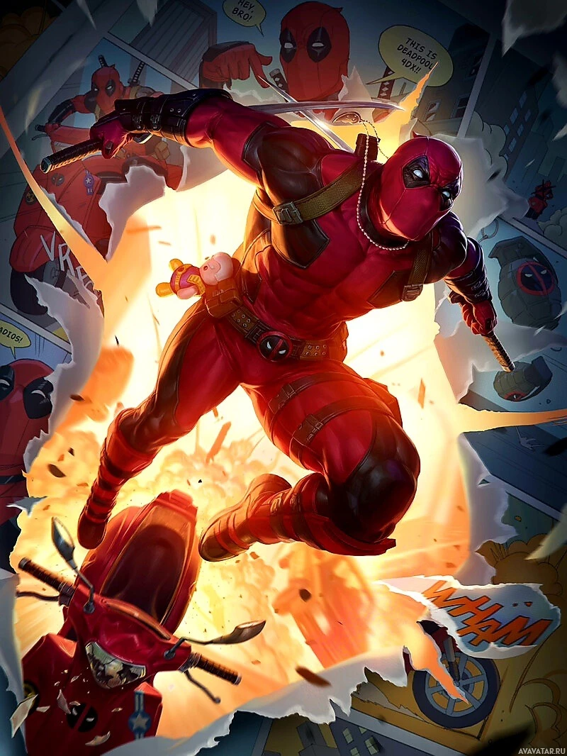 The image features the character Deadpool, known for his superhero alter ego with