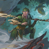 a dynamic pose, with one hand holding a bow and the other grasping a staff or wand. They are wearing armor that appears to be of nature-inspired design, suggesting they might be a ranger or hunter type of
