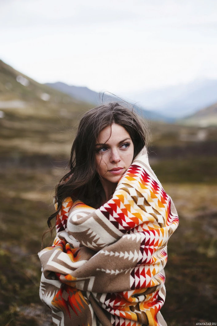 long hair and a neutral expression, wrapped in a patterned blanket with colors that suggest it may be Native American in design. She appears to be in