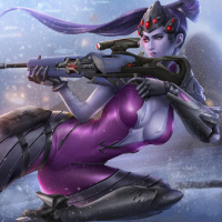 The image shows a character from the game Overwatch, who is known as Widowmaker. She is depicted in a pose with one hand on her hip and the other holding a rifle, which suggests she is ready for combat or in the middle of it. The character is wearing her signature