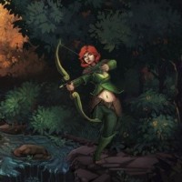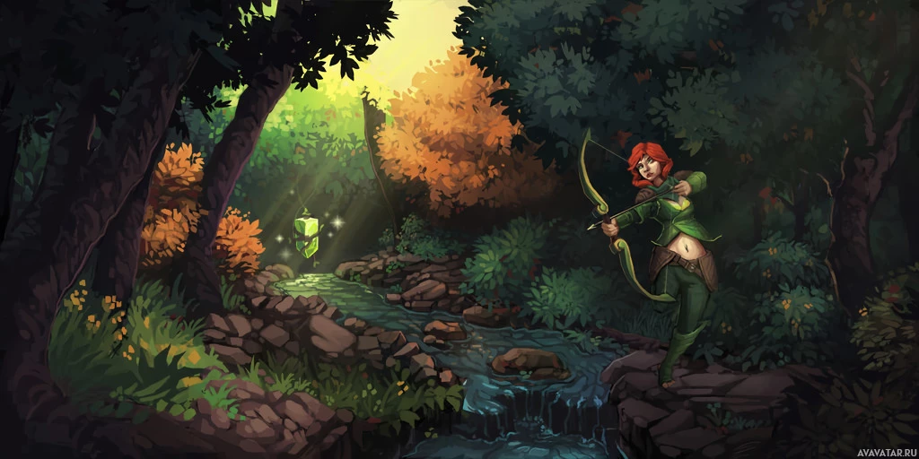 a fantasy setting, with lush greenery and trees surrounding them. It appears to be either dawn or dusk given the warm,
