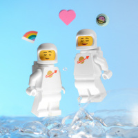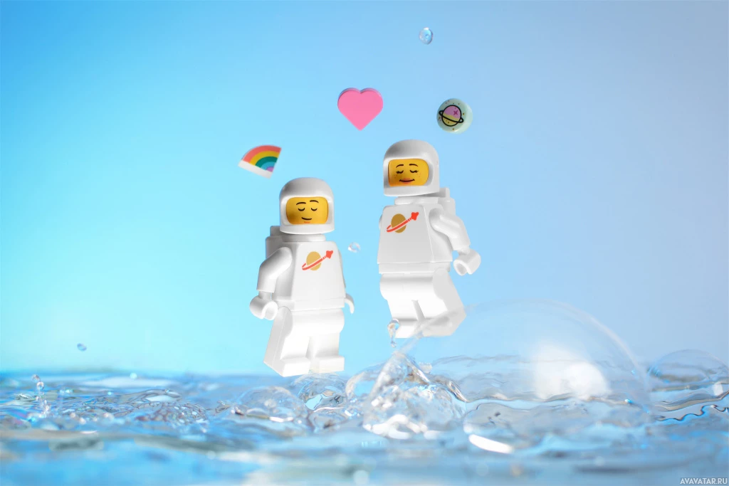 The image shows two Lego astronaut figures positioned as if they are standing on ice or