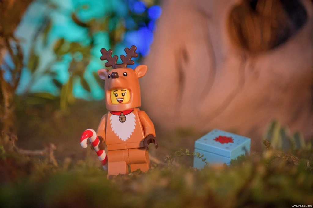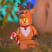 a Lego figure resembling Rudolph the Red-Nosed Reindeer, which is a popular Christmas carol character. The figure is standing on what appears to be