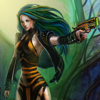 a striking outfit that includes yellow and black elements, which might suggest she has a role in combat or stealth operations. She holds a pistol in her hand, pointing it forward as if ready for action. The background has an otherworldly appearance, with green and purple hues, suggesting