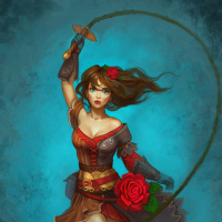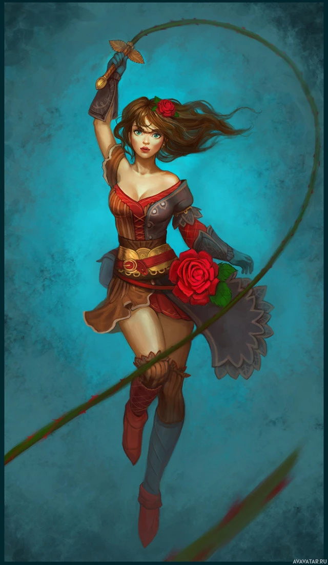 a fantasy world. The character is holding what seems to be a whip in one hand and flowers in the other. Her pose indicates movement, as if she's dancing or spinning with her whip. The background has a dark blue hue, which could be a representation of