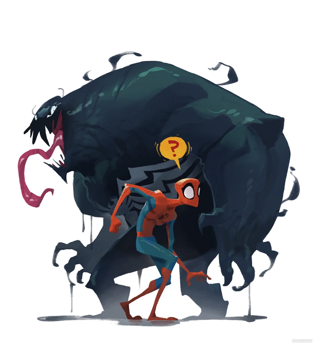 a question mark, which could imply that Spider-Man is asking a question or posing a challenge to Venom. The image captures a moment of action and anticipation typical of superhero comic book storylines.