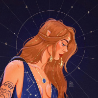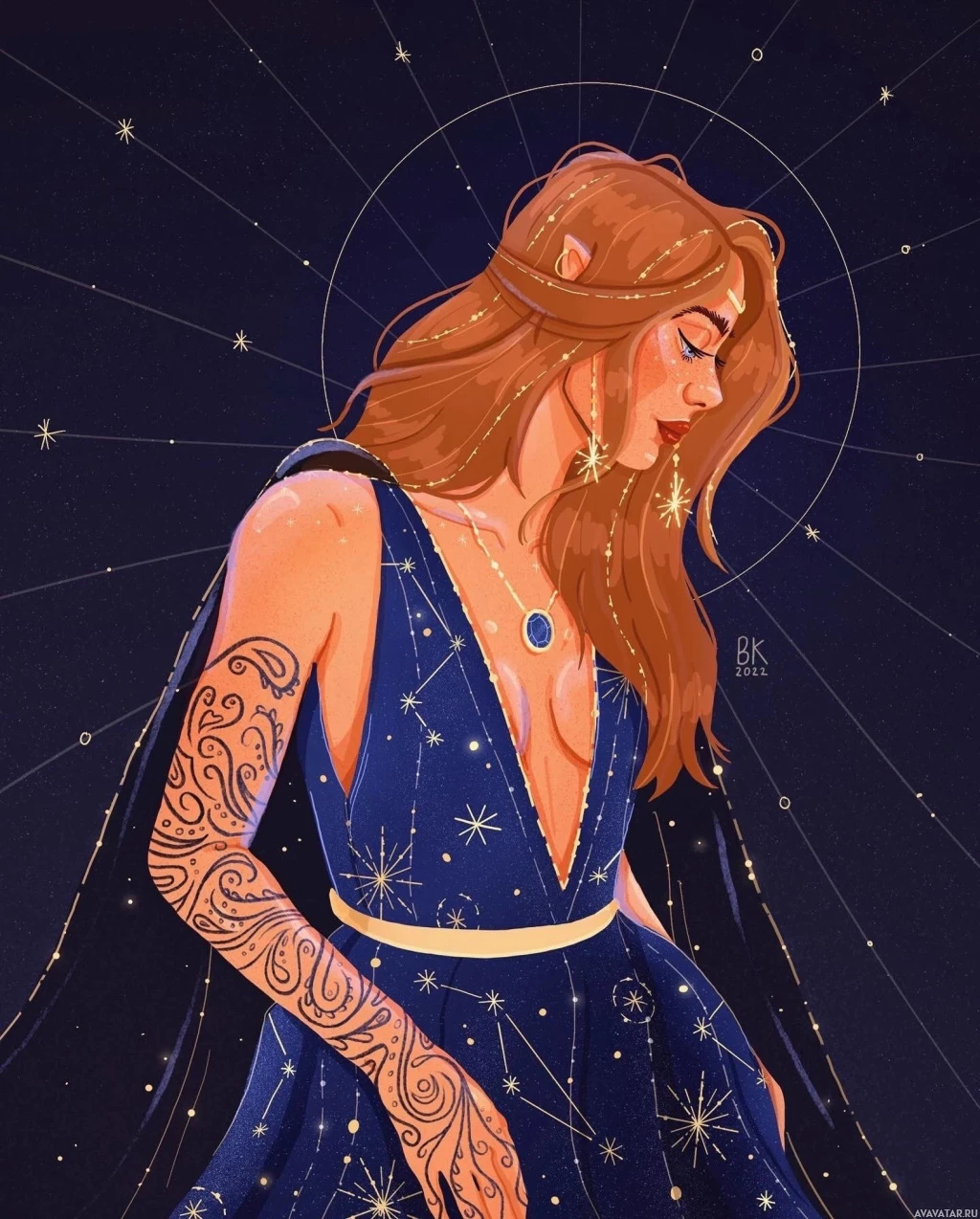 celestial motifs like stars and constellations, enhancing the fantastical theme of the artwork.