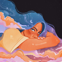 a cloudy sky with some clouds that have a star shape. The artwork is colorful and has an abstract feel, with