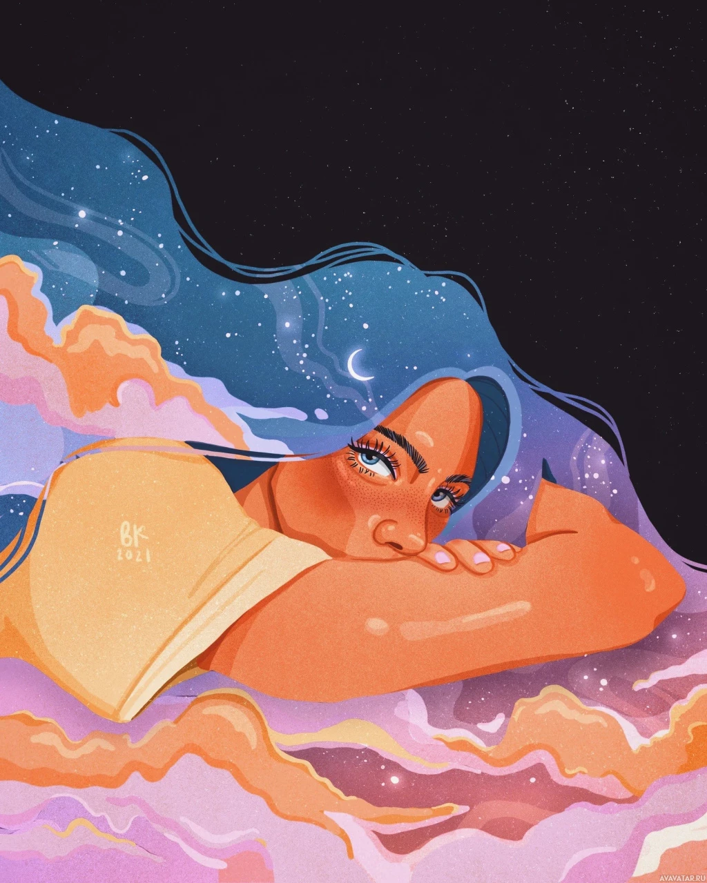 vibrant hues dominating the palette. The girl is wearing a light-colored top.