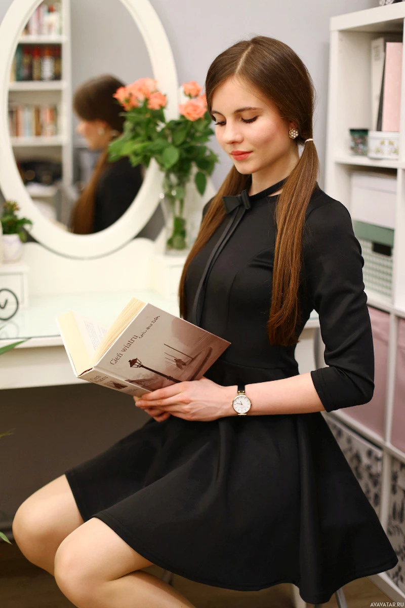 a black dress with a V-neckline and has her hair styled in braids. In the background, there's a mirror reflecting the image of the woman and another person who appears to be standing in front of the mirror. There are also some books stacked on the desk and a vase with flowers on it. The setting seems to be