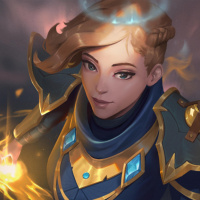 blue eyes, and light brown hair styled in a short haircut. They are wearing what seems to be magical or