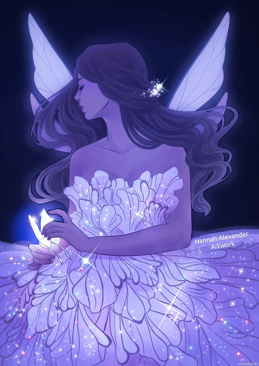 The image depicts an illustration of a fairy with human-like features. The fairy is wearing a gown adorned with stars and flowers, and she has