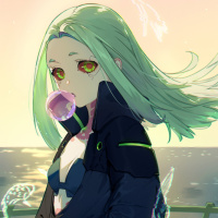 The image depicts an animated character. This character has green hair and is wearing a black jacket with some blue accents. There are glowing elements on the character's body, suggesting a futuristic or cyberpunk theme. The background shows a sunset over water, which adds to the overall atmosphere of the scene. This character resembles Rebecca, one of the playable characters in the video game "Cyberpunk 2077."
